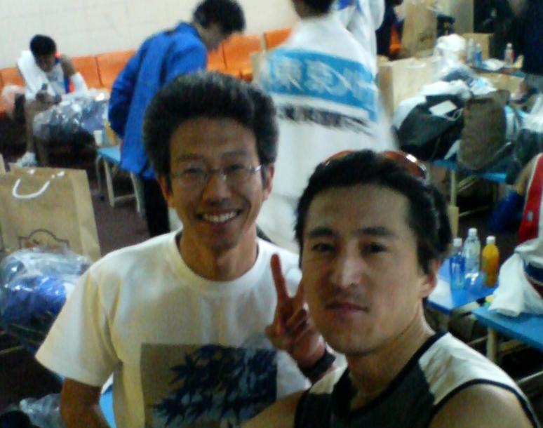 再び、アップ用に服を着替える。スタート45分くらい前になるとみんなアップのためにトラックに出るので、自分も出て一応ジョグをする。トラック内でも結構風が強い。5周くらい走ったところでやめる。適当にストレッチしていると、高岡選手がアップをしていた。レースでは絶対に一緒に走れないので、このときとばかりに彼の後についてアップをする。(このときに私のウィンドブレーカがTVに映ったようだ)携帯で写真を撮ろうと思ったがさすがにやめた。1周付いたところで終了。さすがにアップも早い。以前福岡国際の時に早田(俊幸)選手のアップに付こうと思ったが、あまりに速すぎてつけなかったのを思い出した。
