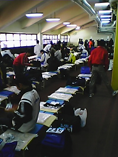 ホテルを9時半頃にチェックアウトしていよいよ国立競技場へ移動した。初めての場所なのでどこから入ったらよいか困ったが、進入禁止ならばガードマンに止められると思って近くの適当な場所から入った。しばらく廊下を歩いて選手の控え室(左写真)に到着。ここからは選手しか入れないようで、妻とはここで別れた。更衣室に入ると大学つながりの知り合いに会い、しばらく話をする。出走までの準備の流れを聞く。荷物の移動、ロゴのチェックなど。ロゴのチェックなんか初めての経験だ。フルにウォーミングアップなんか特に必要ないので、暇をもてあました。たまに高岡選手が近くを通り過ぎる。やはり背が高かった。そのうちに係員が11時になったらロゴチェックをするのでレースの格好をして集合せよ、と連絡する。1時間前にユニホームを着なきゃいけないのか!と、少々不条理を感じながら11時10分くらい前にユニホームに着替えてチェックの準備をする。チェック場所がまた狭いところ(左の写真の奥)で大混雑。なんとかならないものかと大会規模と運営状況とのギャップを感じた。自分の番になる。チームのロゴの下の細かい英文にクレームが付き、ナンバーカードで隠すようにと指導を受けた。一応カードを付け直したが、その後のチェックはなかった。結構いい加減だった!