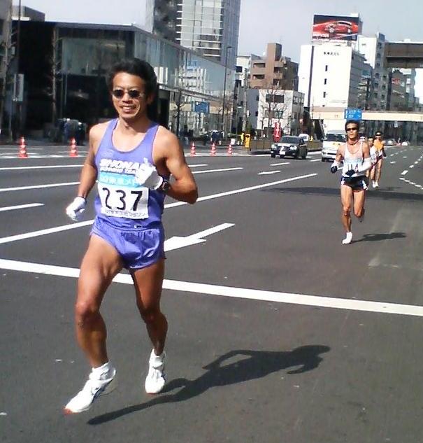 この5キロも17分45秒のペースでほぼイーブンだった。しかし、この辺りから少々脚が重くなり、ピッチが維持できなくなってきた。この35キロからの1キロが3分36秒かかり、とうとうマラソンの壁が立ちはだかってきた。しかし、このペースでもまだ前を抜くことができるペースであった。飯田橋の交差点を過ぎていよいよあの上り坂がやってくる。しかし、カラダがだんだんとしびれてきた。市ヶ谷駅横で10名くらいの集団に追いつく。そこには来季からチームメートになるM岡選手がいた。この集団についていけば楽だろうと思っていたが、途中の通過タイムが5キロ18分以上になっており、ここでペースダウンすることを考えると30分切りは難しいと判断し、自分のペースで抜きにかかった。奇しくもちょうどそこが一番の急坂になってしまったが、ここが正念場と思い、ペースを上げて攻めの走りでのぼりにかかった。何とか集団を後にして上りきった四谷駅前の交差点では精根尽き果てて全身がしびれた。残りはまだ3キロ。30分切りは無理だと考えてしまい、気持ちが切れたとたんに集団が後から抜きにかかった。集団の後あたりになったところで40キロの通過となった。マラソンの壁と市ヶ谷の壁のような坂。二つの壁に襲われた。