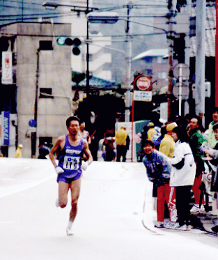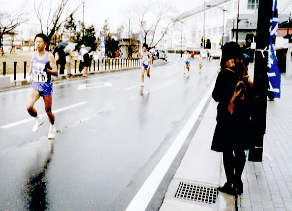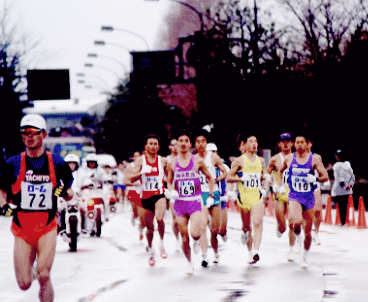 12時30分、予定通りにスタートした。スタートは一番後ろからといつも決めていて、この位置が自分の設定ペースにちょうどあうし、また後でビデオを見た場合自分を見つけやすいという利点もある。競技場を出る手前の1000mの通過は3分20秒ぐらいでほぼ設定通りだ。しかし、この後少々ペースアップをしてしまい、5kmの通過が16分台とオーバーペースとなってしまった(左の写真は約7km付近で一番右のランナーが犬塚選手)。このあと、集団を常に引っ張ることになり、だいたい5kmを17分のペースで25kmまで行けたが、ハーフの地点で足が重くなってこのあと苦戦を強いられることになった。やはり集団を引っ張るのは非常に疲れることを実感した。